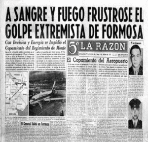 El tiroteo se escuchaba a través del teléfono, en ese mismo instante aterrizaba el avión que los terroristas habían capturado en pleno vuelo. Los pasajeros fueron bajados del avión. Los guerrilleros cargaron más combustible en el avión y lo ubicaron en la cabecera, con los pilotos dentro y listos para despegar. Los gendarmes Domato, Sosa, Ibáñez y el chofer Gom, partieron a toda velocidad hacia el aeropuerto en un patrullero. Desconocían que otros subversivos estaban atacando el Regimiento 29 de Infantería, ubicado en otro sector de la ciudad.
